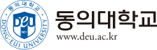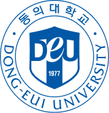 교표는 전체적으로 진리, 정의, 창의의 교육목표를 추구하며 전통과 최첨단이 공존하는 미래지향적인 동의대학교의 이미지를 형상화한 것으로, 중심에 있는 DeU는 Dong-eui University의 약자이다.